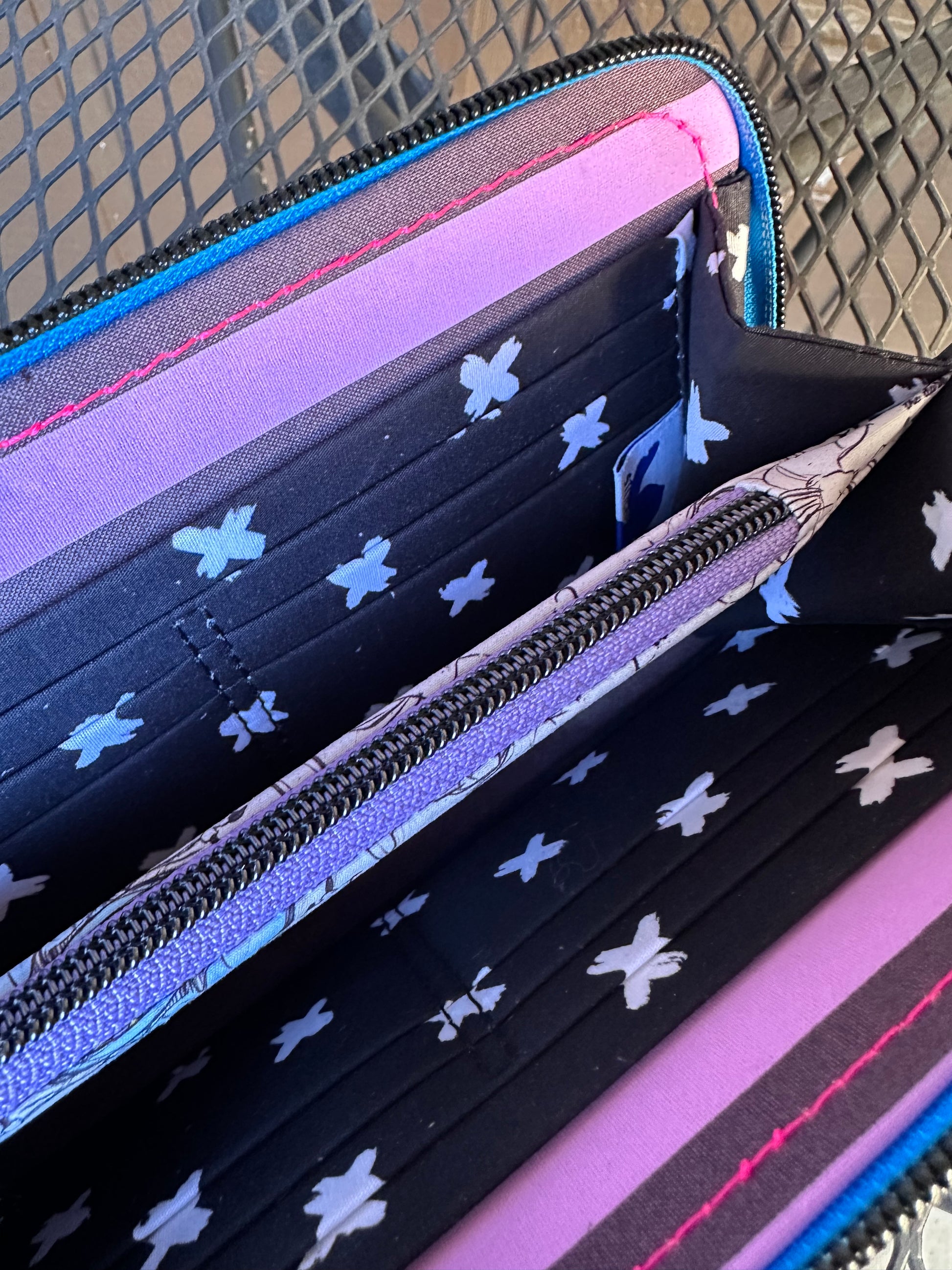 - 2 open pocket areas between the center zip pouch and card slots